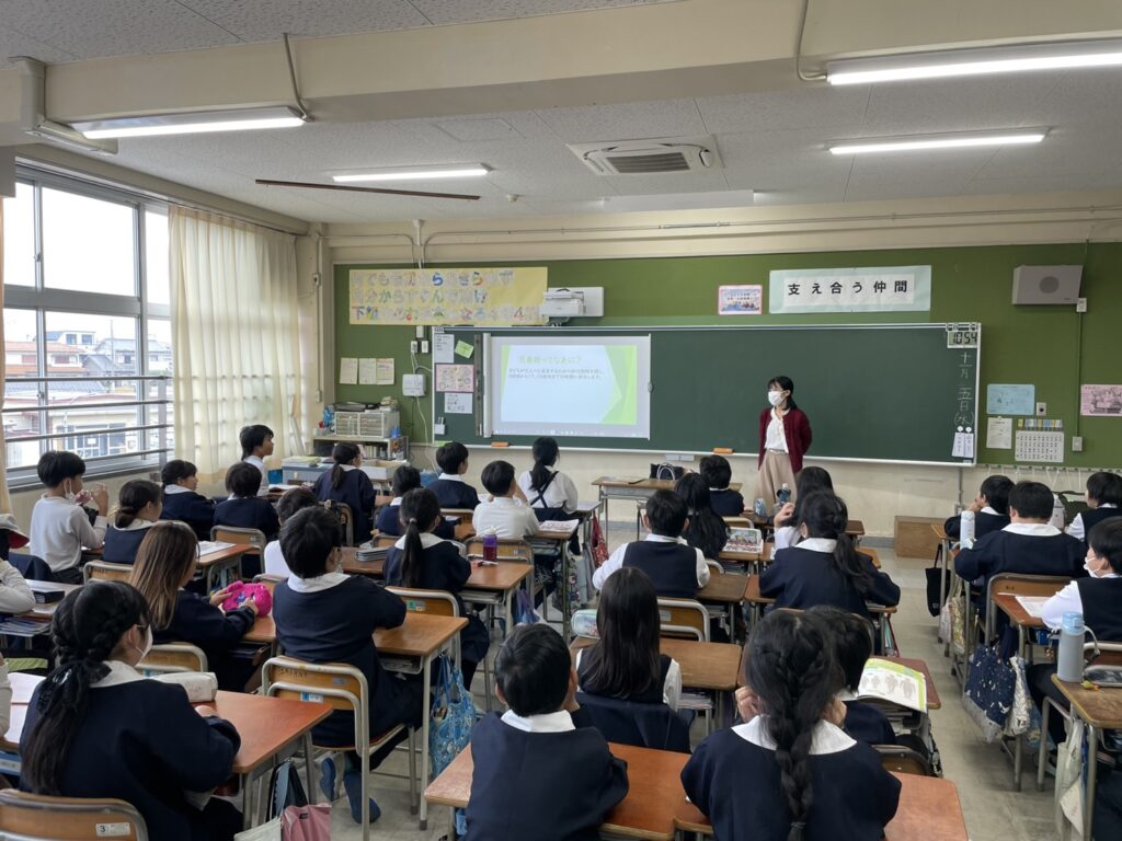 今月は明石市内のとある小学校の4年生と、中学校の2年生に、1クラスずつ教室に入って授業をさせていただきました。