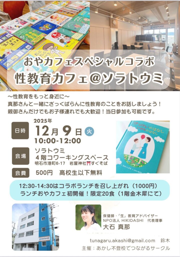 明石での定例の性教育カフェは、毎回来場者はあまり多くはなくて、中にはゼロの日もあるのですが、来てくださる方はこうしてわざわざ調べて市外あるいは県外から来られることも多く、この場が数少ない貴重な場になっていることを感じます。