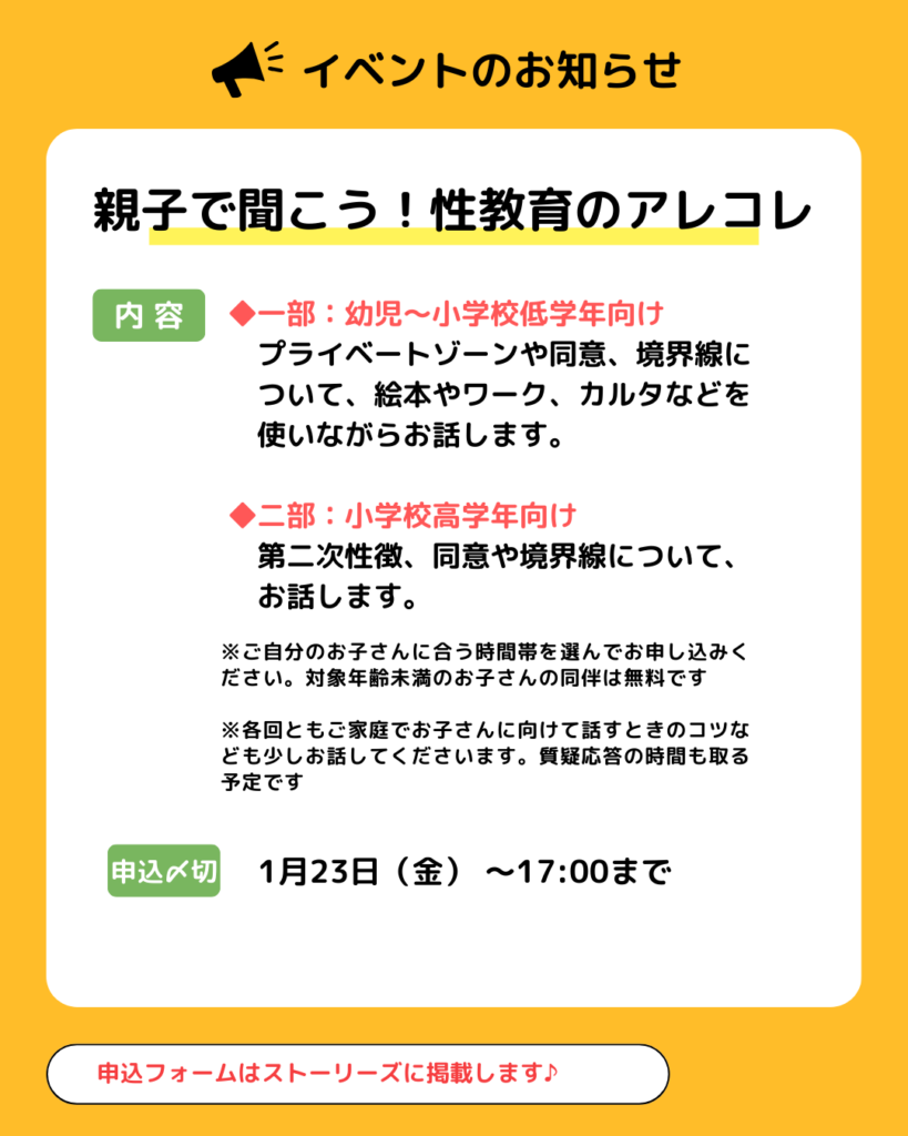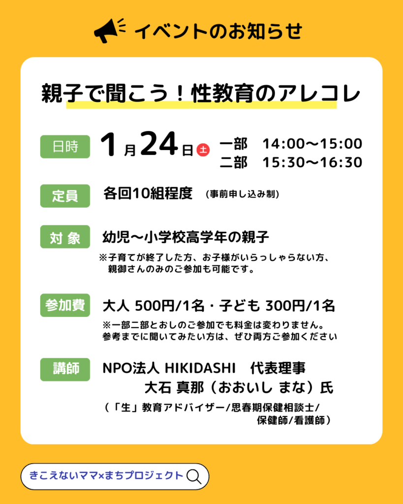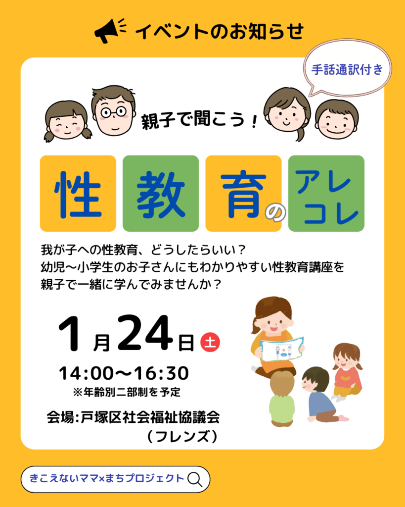 今回、以前からご縁のあった「きこえないママ×まちプロジェクト」さんの主催で、親子向けの性教育講座を横浜で開催できることになりました。