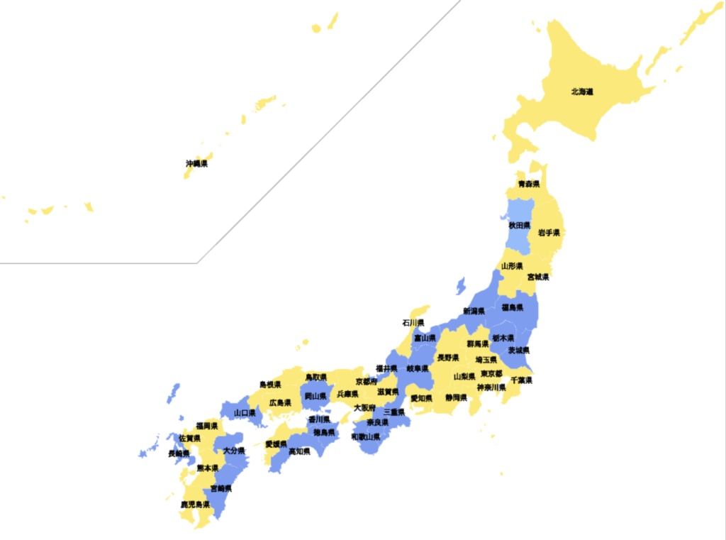 (黄色くなっているのがアンバサダーのいる都道府県です。)